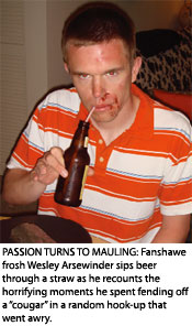 Student Wesley Arsewinder claims to have been attacked by a cougar in his dorm during Orientation week activities and has the scars to prove it.