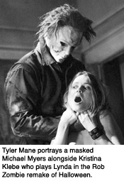 The new Halloween, which is written and directed by Rob Zombie and was in theatres this past August, follows the same story as the original, with a few additives. This movie really emphasizes how Michael Myers came to be a psychopathic killer, and therefore spends a lot more time on his childhood than the original. Michael's mother, Deborah Myers (Sheri Moon Zombie), is a stripper, so she is never at home during the night. He is left alone with his two sisters, Judith (Hanna Hall) and Baby Boo and his mother's abusive boyfriend, Ronnie White (William Forsyth).