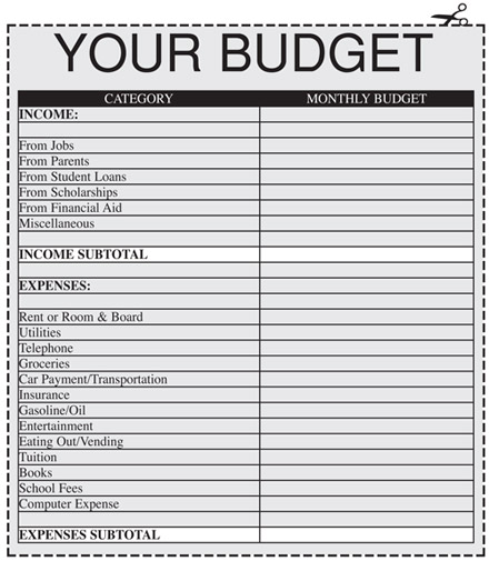 Make a budget: | The first step in managing your money is to draw up a budget that allows you to see where your money is going, and how much you have to work with. Also, by separating the important items (rent, tuition, etc.) from the non-essentials you will be able to see how much spending you really have. Still think you can afford that 50” plasma in your bedroom? |