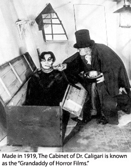 Made in 1915, it's the story of a giant clay man built to protect a small town who goes wildly out of control. Also from this era is a film often cited as (the granddaddy of horror films”; The Cabinet of Dr. Caligari.) Made in 1919, the film takes place in a lunatic asylum and features an evil doctor and his falsely incarcerated patient. As the film progresses though, it becomes difficult to determine who is mad and who is sane.
