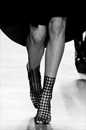 “Latticework grids of leather with metal-mesh heels—were enough to score a huge hit. First, they were walkable; second, they represent a coolly modern collision of the airiness of multi-strapped gladiators with the look of a boot. In a season when so much footwear has limped off runways to muttered protests from female audiences, that point alone puts YSL in the lead.”