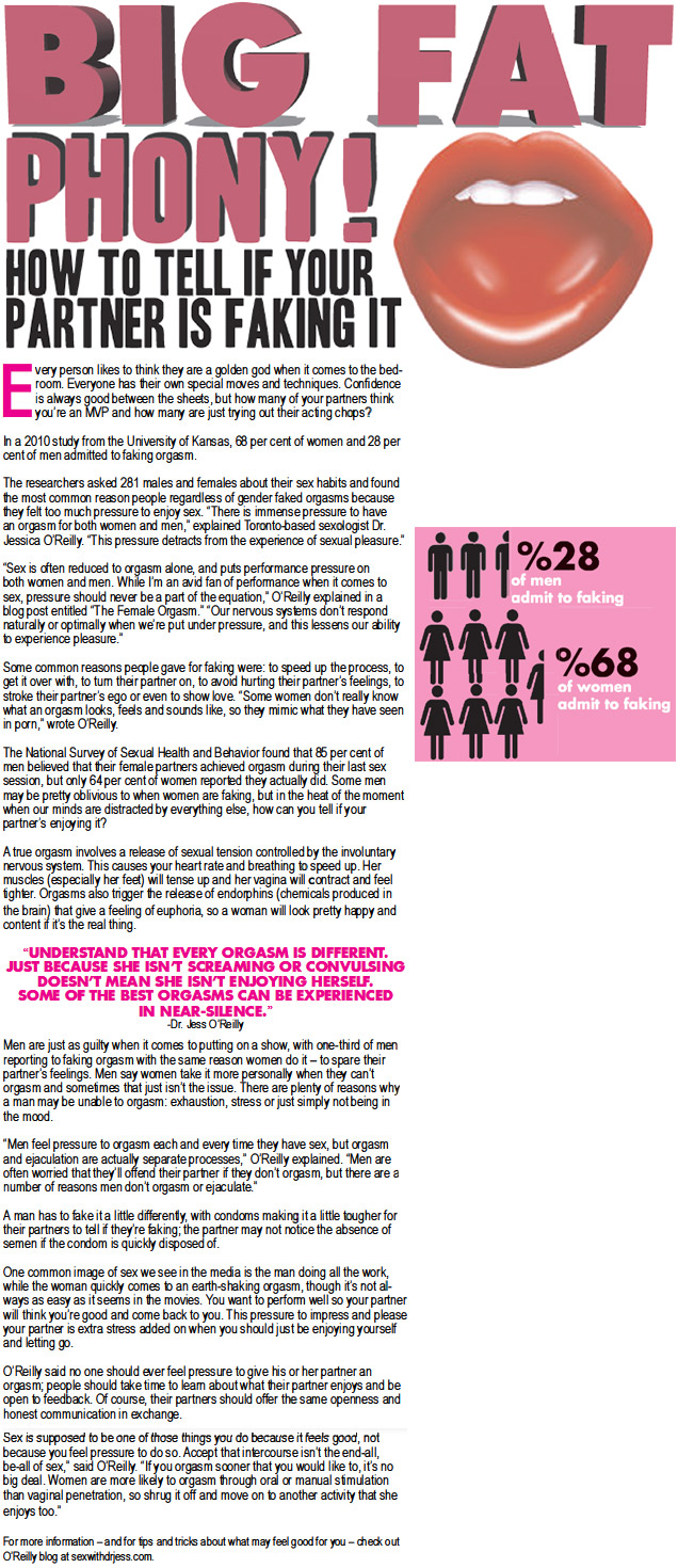 Big fat phony! How to tell if your partner is faking it Connor Dunster Culture September 16, 2013 Previous Article Stroke, slurp and suck your way to pleasure Next Article Play time in your pants: A beginner's guide to sex toys